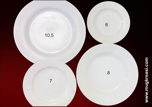 Piring plakat dan piring souvenir dapat dibuat dengan menggunakan piring datar atau ceper seperti piring kue. Piring ini terdiri dari berbagai ukuran yaitu ukuran 6, 7, 8 dan 10.5 inchi. Bahan piring umumnya terbuat dari bahan porcelain keramik. Dengan pembakaran dekorasi 800 derajat, gambar pada permukaan piring ini terlihat bagus sekali. Umumnya pemesanan item ini, selalu dengan dudukan plastik atau kayu.