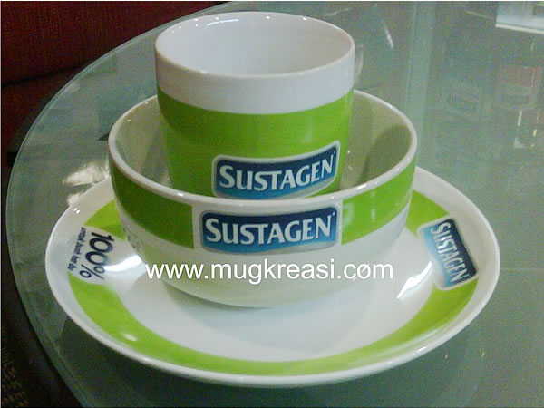 Dinner set dari seri Sustagen set ini terdiri dari 1 buah piring, 1 buah mangkuk dan 1 buah mug/ gelas.